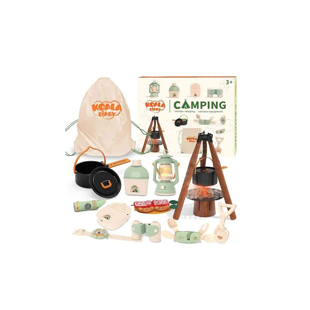 این ست اسباب بازی کمپینگ لوازم ضروری کمپینگ از جمله چراغ روغنی، اجاق گاز، اسباب بازی های غذایی،
