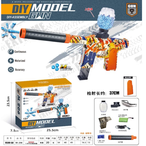 تفنگ تیر ژله ای که با باتری قابل شارژ کار می کند. تا ۲۰۰ گلوله را در یک زمان با برد بیشتر از ۱۵ متر بارگیری می کند.