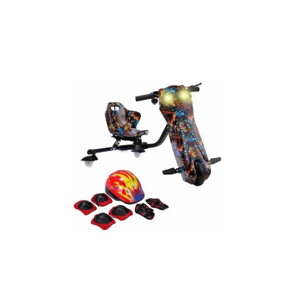 - اسکوتر دریفت شامل کلاه ایمنی، مچ محافظ، زانو و پد آرنج است.