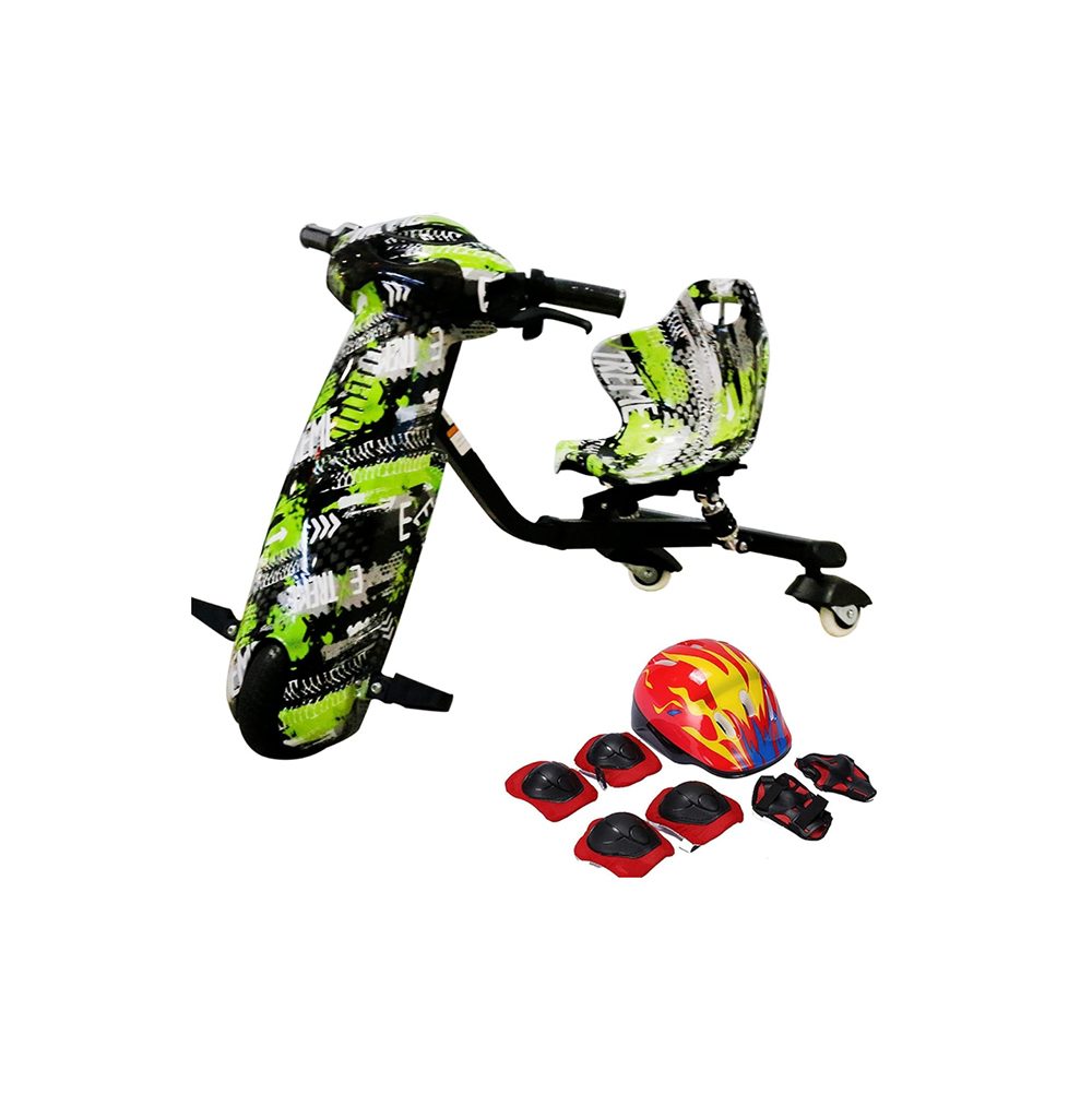 - اسکوتر دریفت شامل کلاه ایمنی، مچ محافظ، زانو و پد آرنج است.