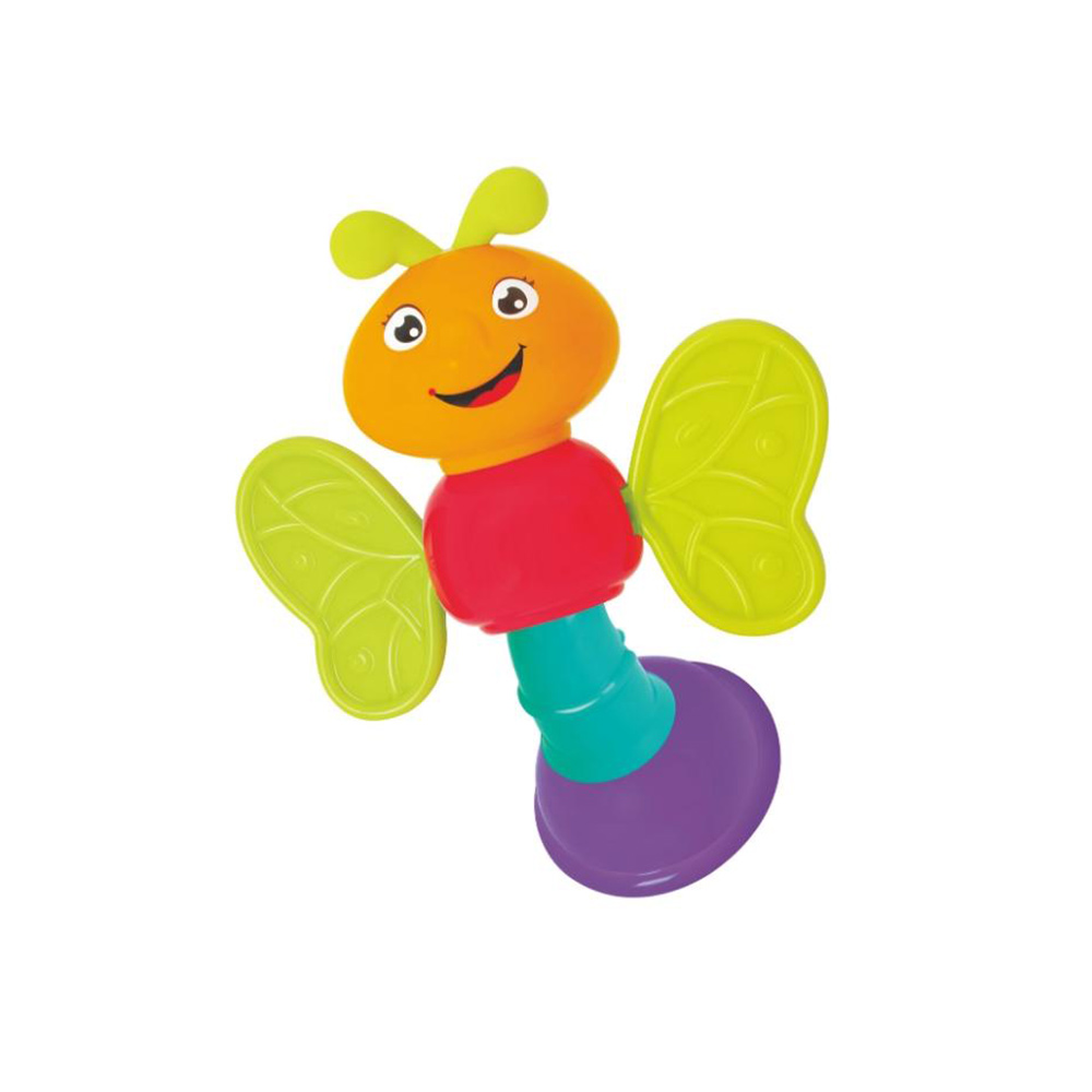 جغجغه پروانه مانند دارای مهره های جغجغه ای در داخل و عناصر رنگارنگی است که حواس کودک را تحریک می کند.