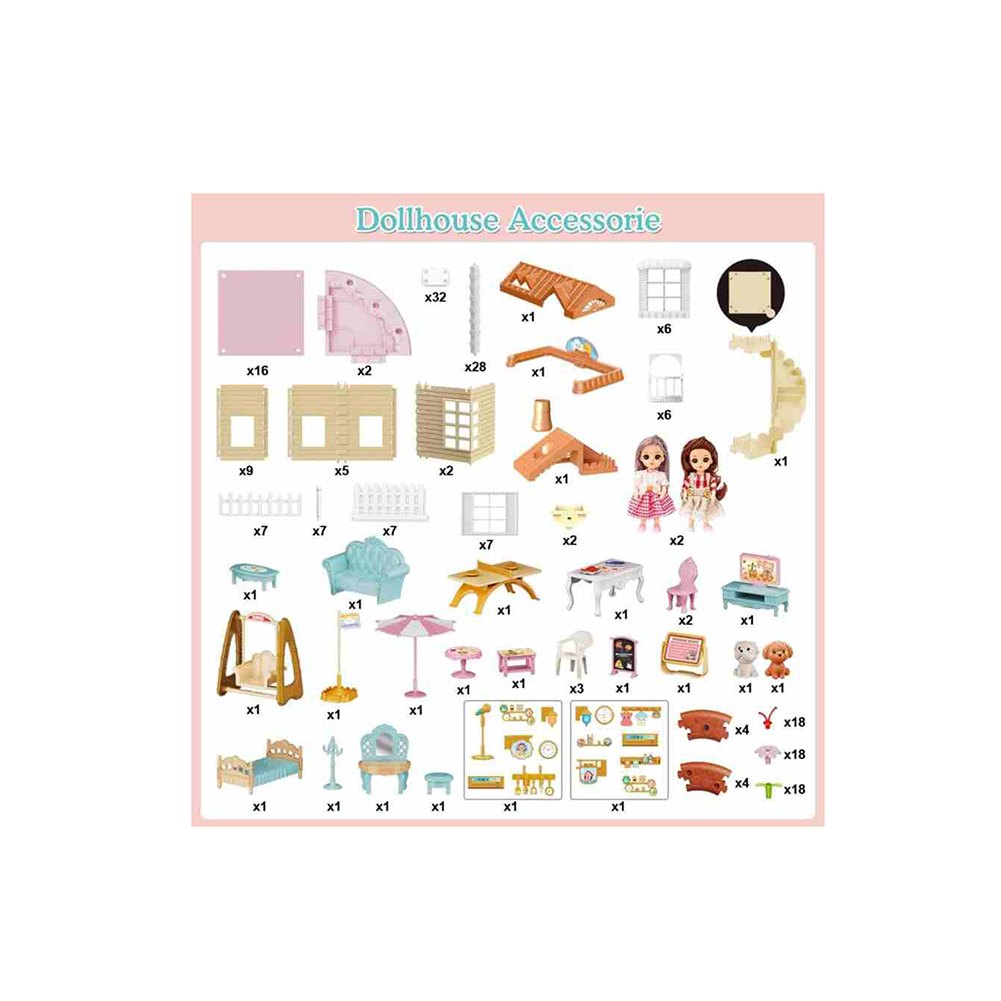 بازی تمام زاویه، یک راه پله مارپیچ، بیش از ۲۰ لوازم جانبی مبلمان، ۲ عروسک بازی و ۲ سگ خانگی.
