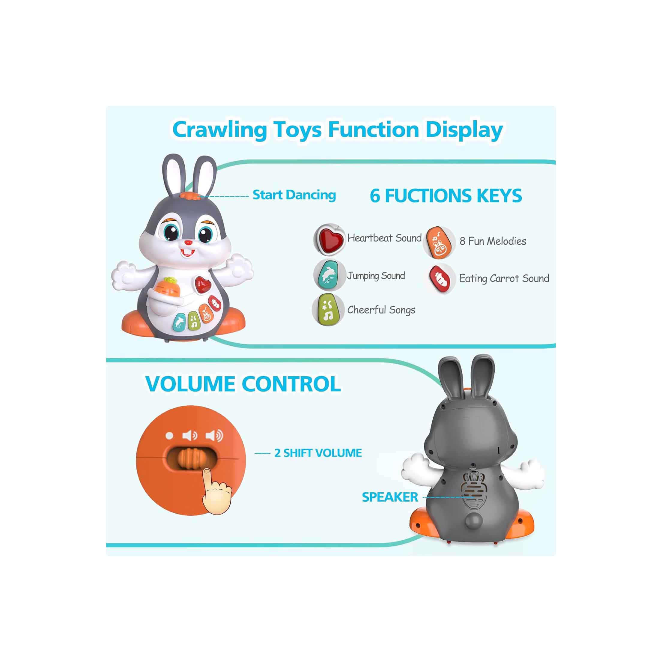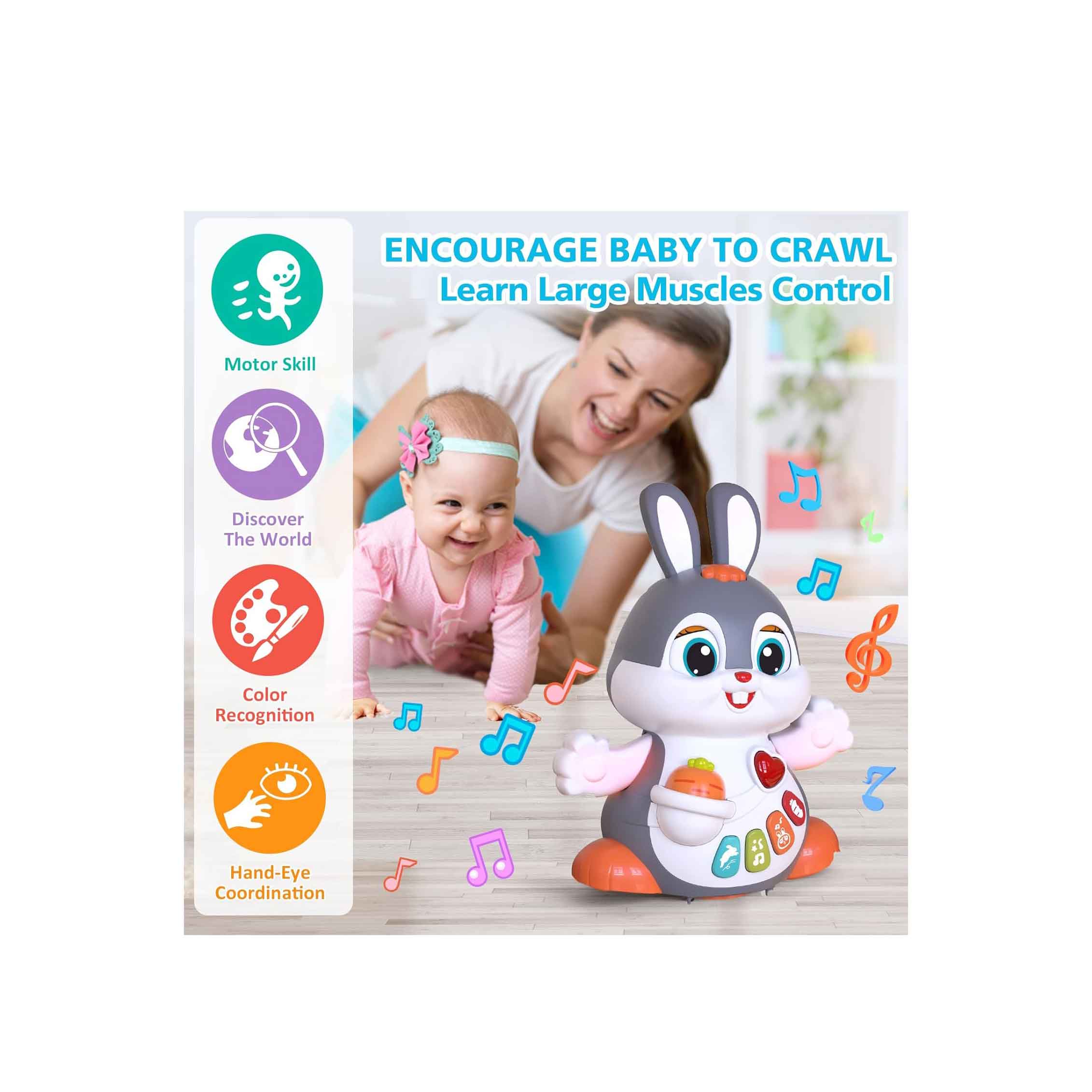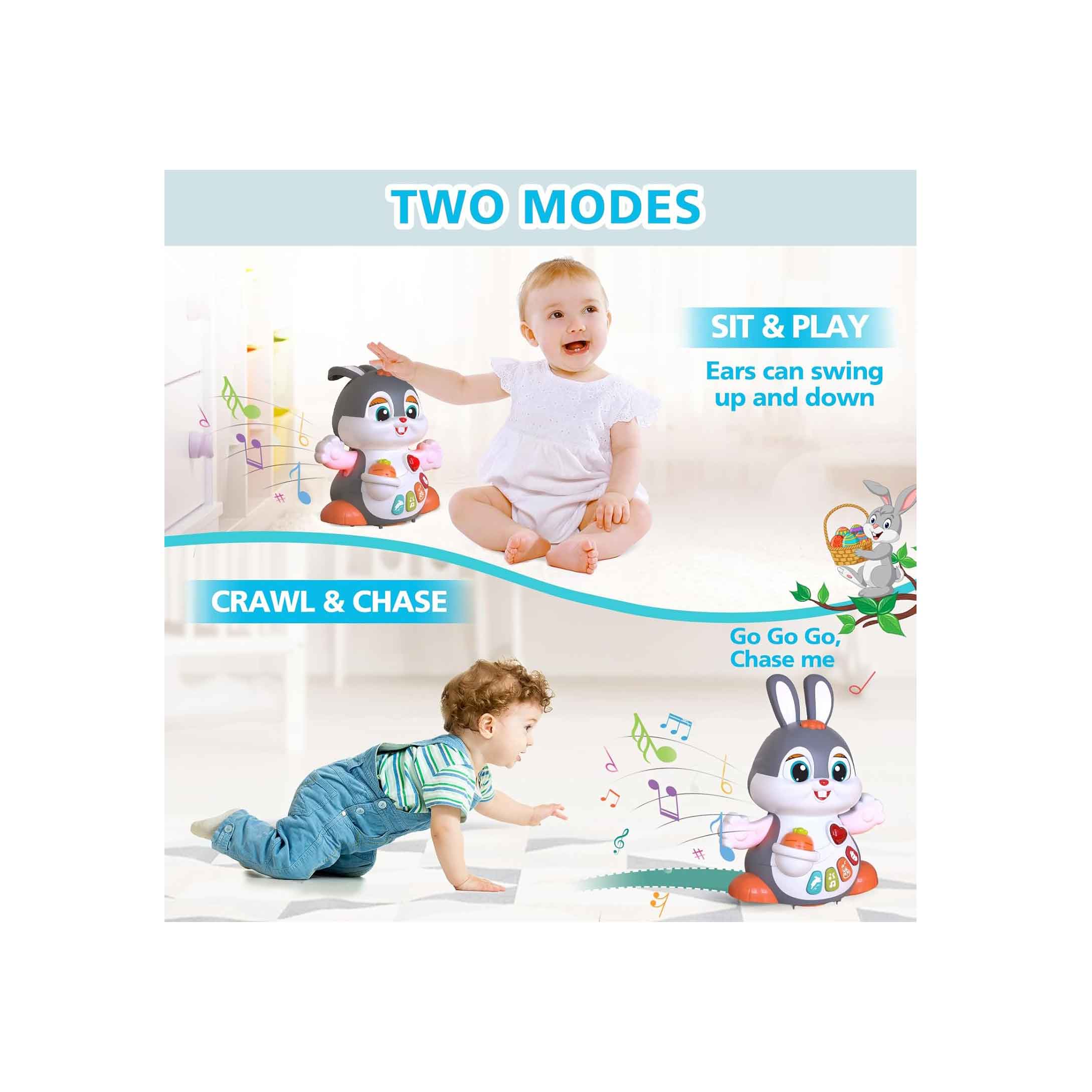 خرگوش هنگام روشنشدن به جلو و دو طرف حرکت میکند تا کودک را ترغیب به دنبالکردن و چهاردستوپا کردن نماید.