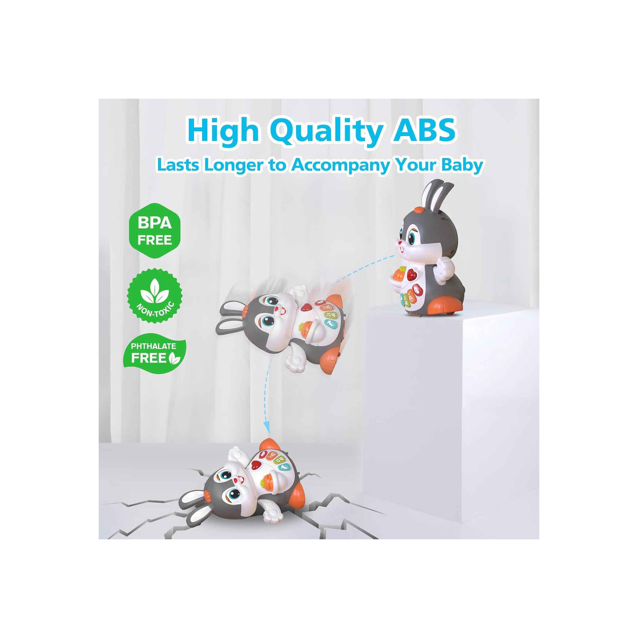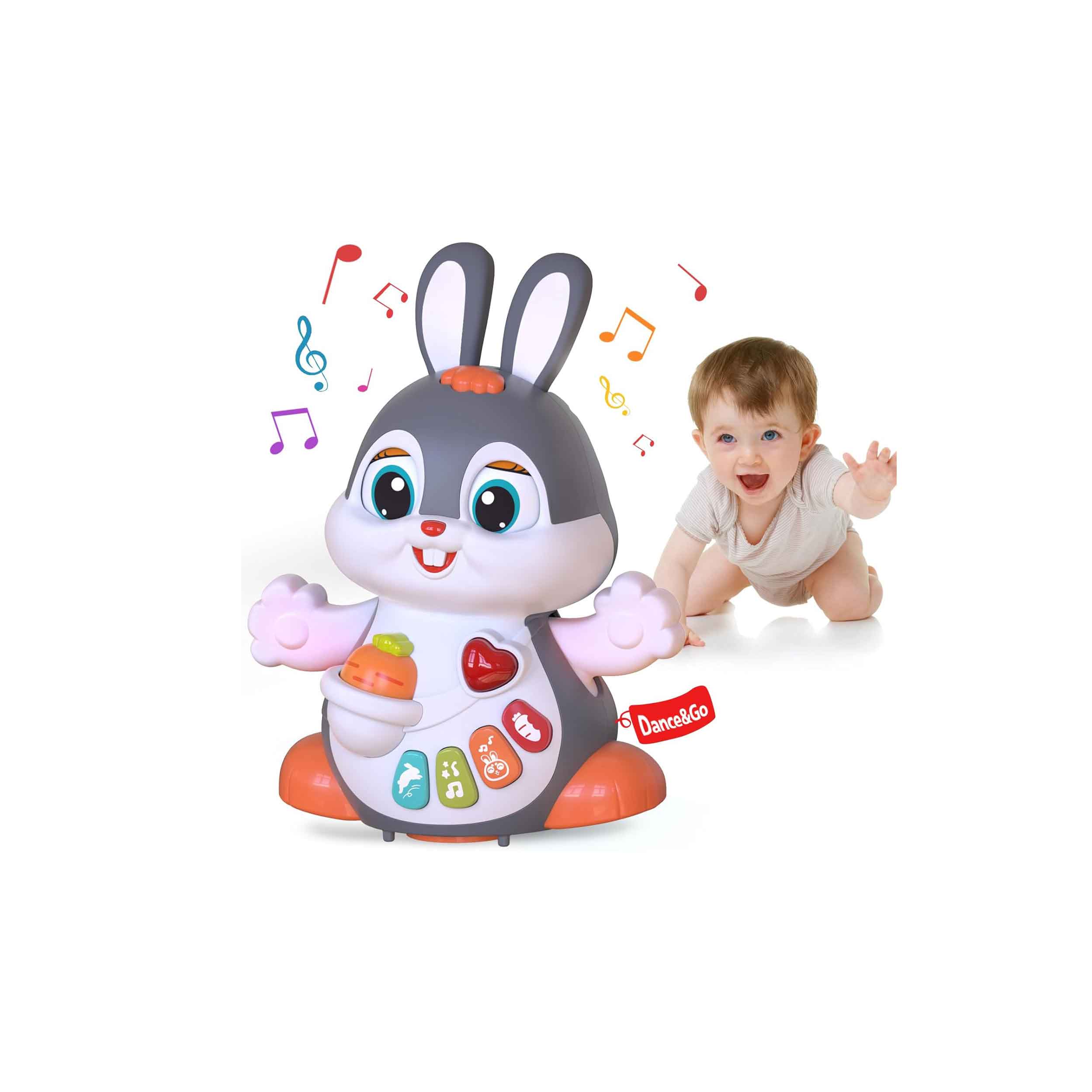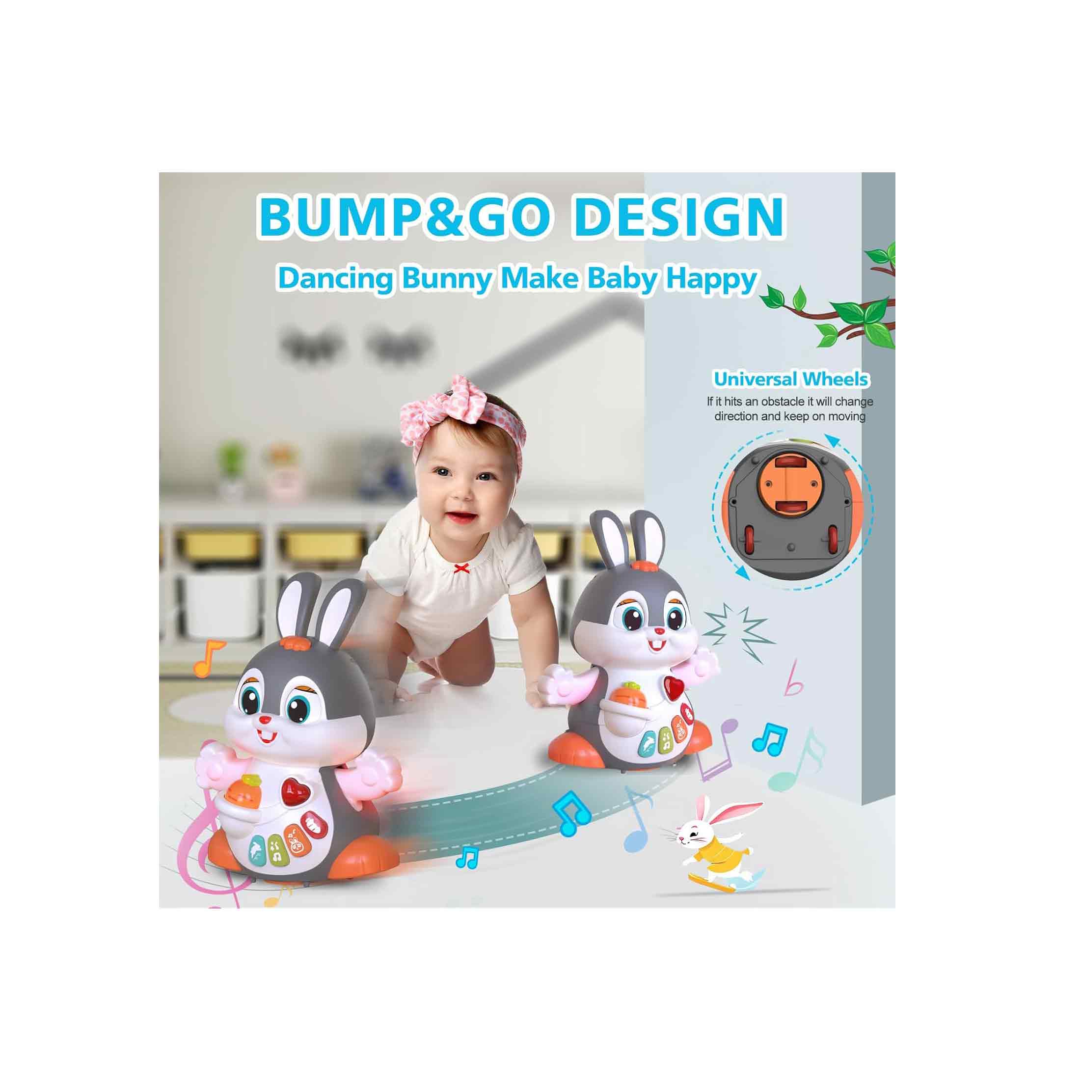 خرگوش هنگام روشنشدن به جلو و دو طرف حرکت میکند تا کودک را ترغیب به دنبالکردن و چهاردستوپا کردن نماید.
