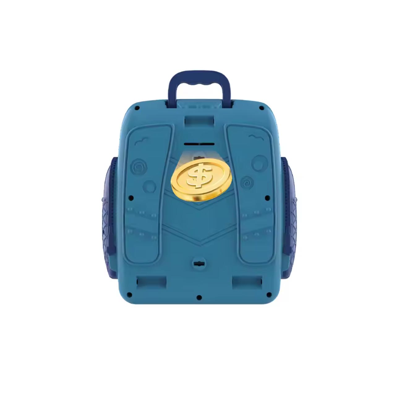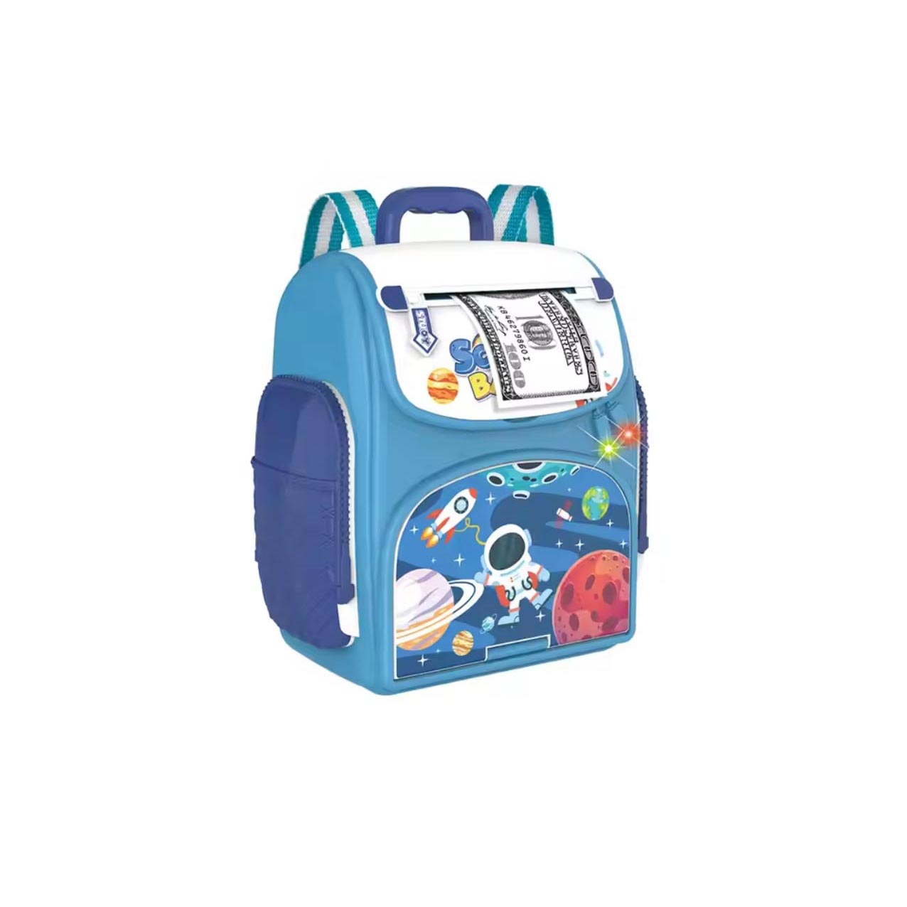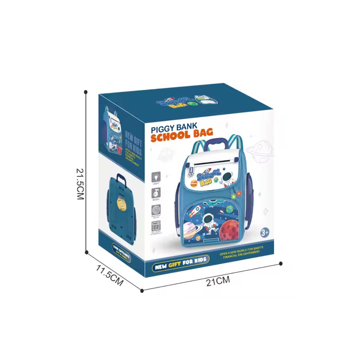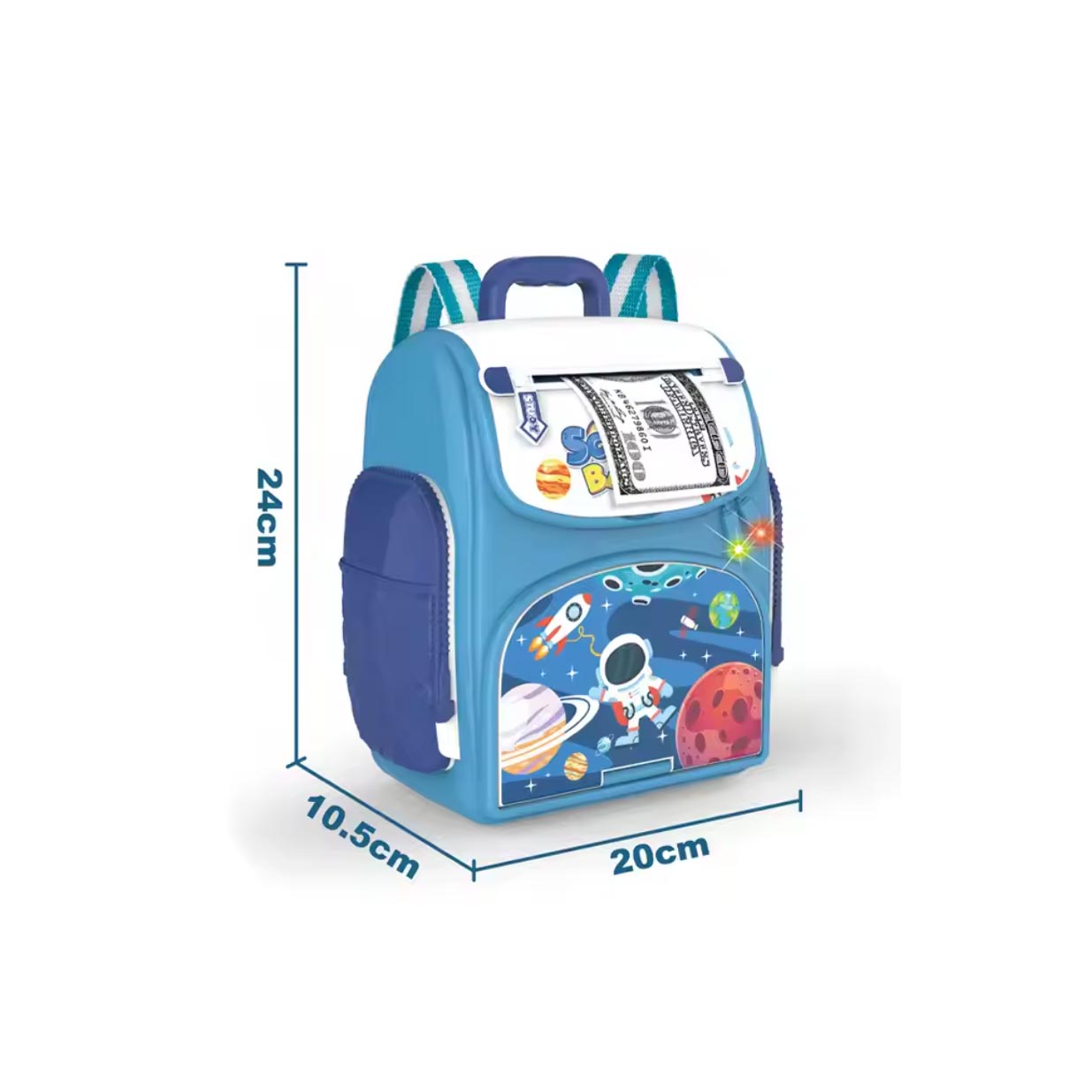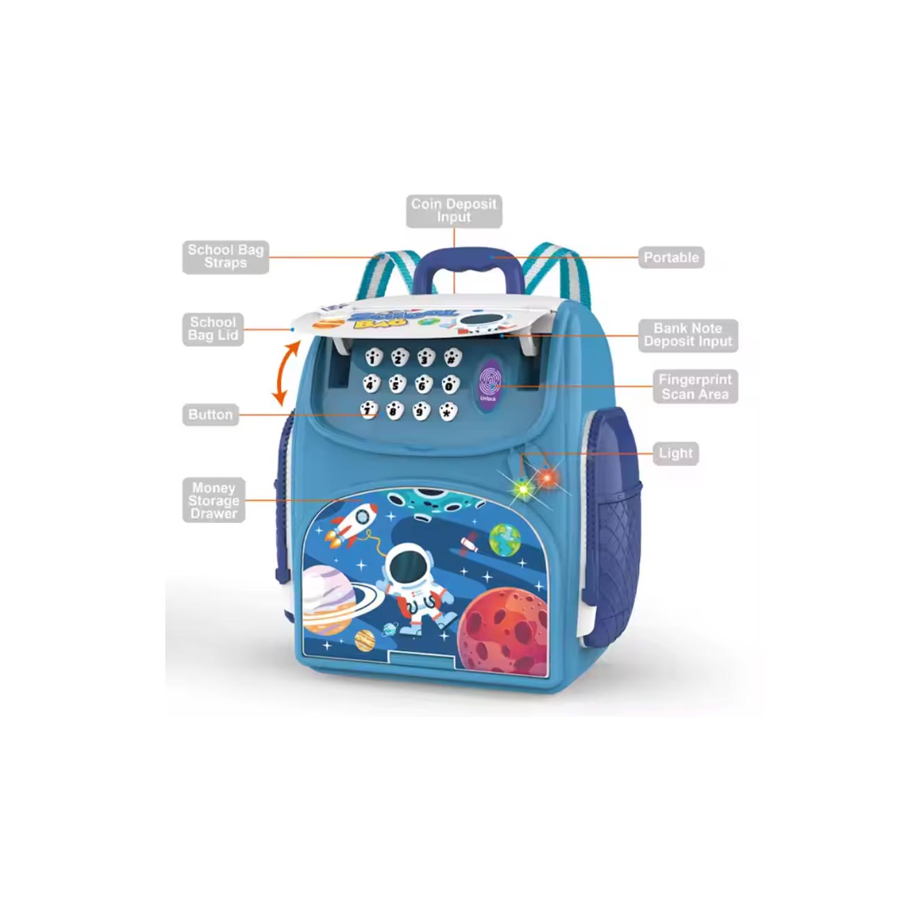قلک رمز دار کودک مدل کوله پشتی کد ۸۶۹۱ با طراحی شبیه به کولهپشتی مدرسه، دارای قفل رمزدار و حسگر اثر انگشت است.