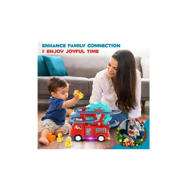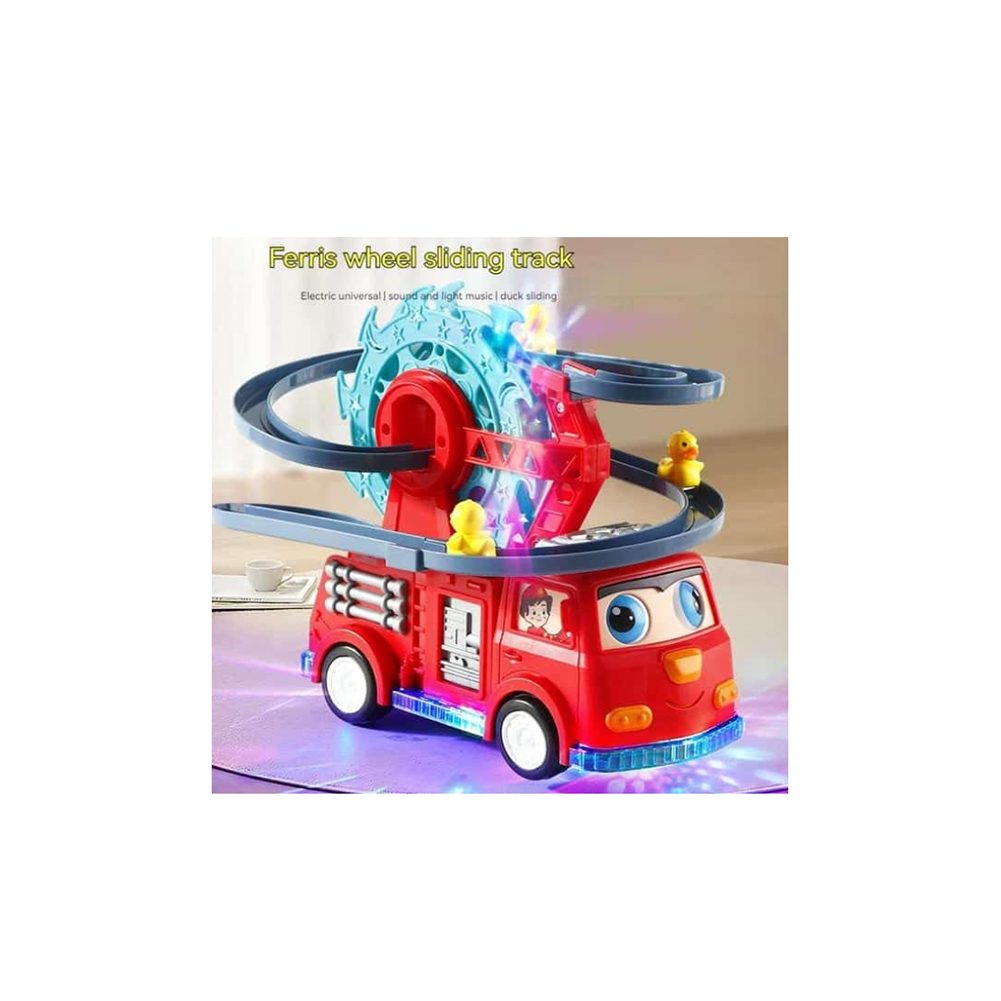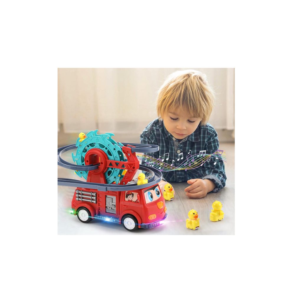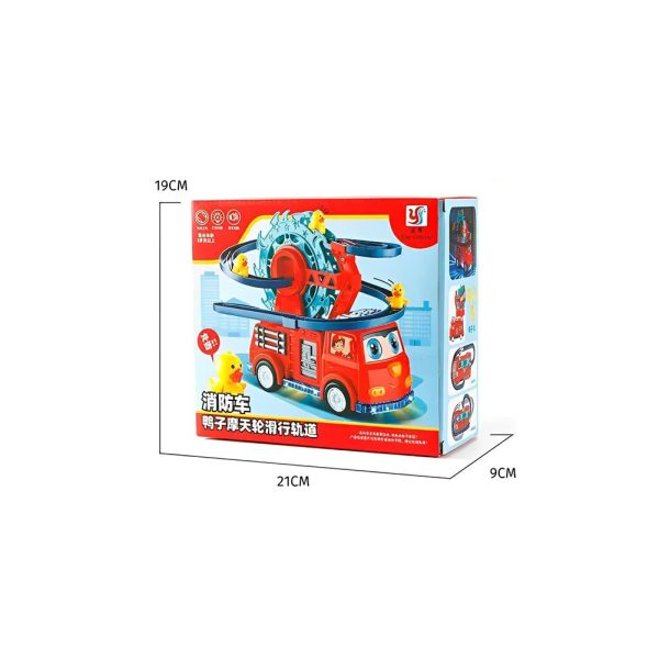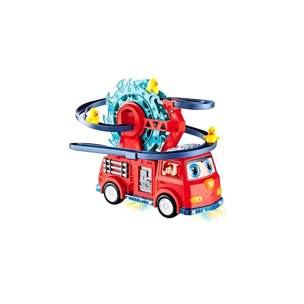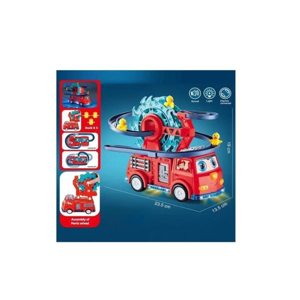 قسمت بالای ماشین آتش نشانی یک سرسره جذاب قرار دارد که با روشن شده ماشین جوجه‌های دوست‌داشتنی روی آن می‌رقصند و حرکت میکنند.