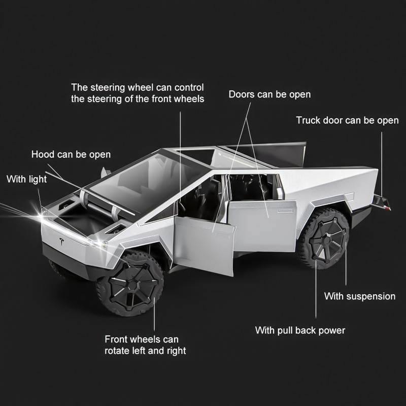 ماشین فلزی تسلا مدل سایبرتراک Tesla Cybertruck زیبا با طراحی واقعگرایانه و جزئیات دقیق، حس رانندگی واقعی را برای کودک شما زنده میکند.