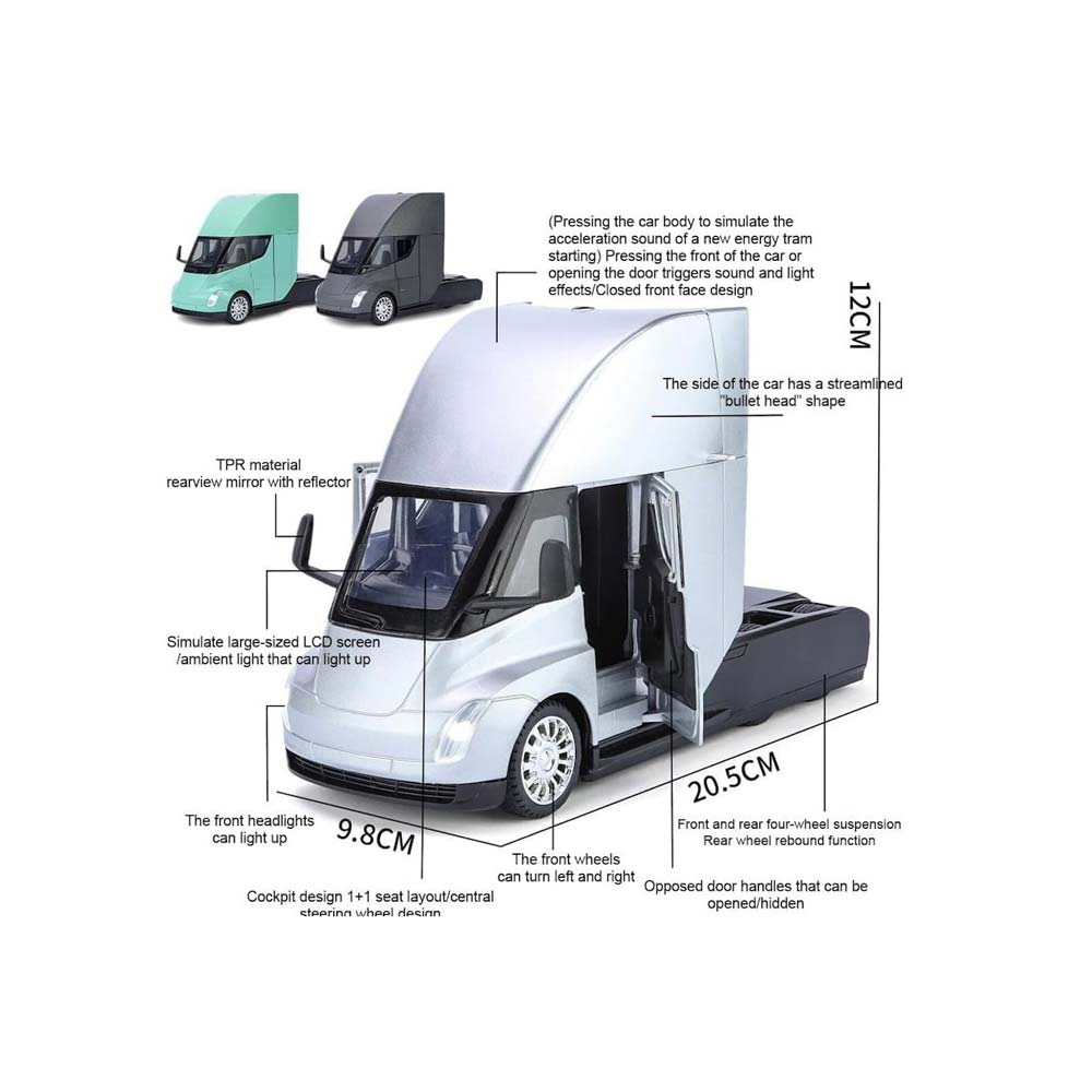 ماکت فلزی تریلی تسلا کد 2449B یک مدل شیک و واقع‌گرایانه از تریلی مفهومی تسلا است که با جزئیات دقیق و کیفیت بالا ساخته شده است.
