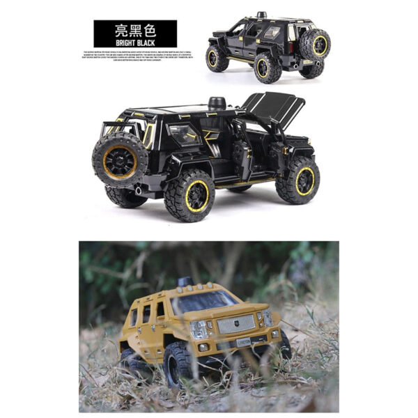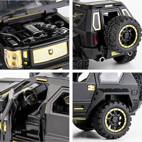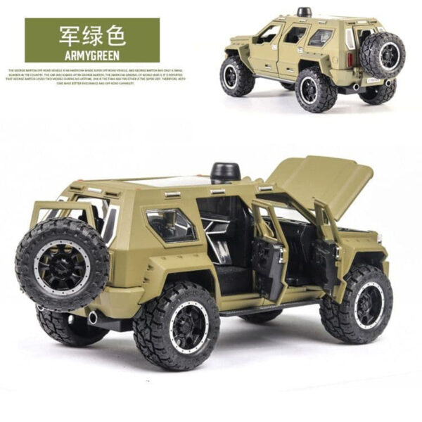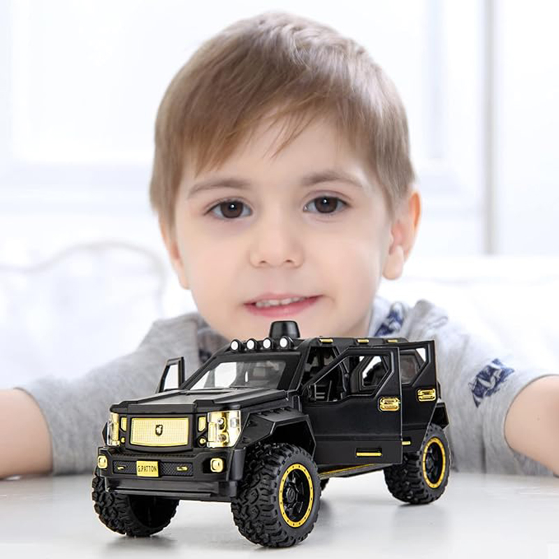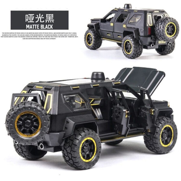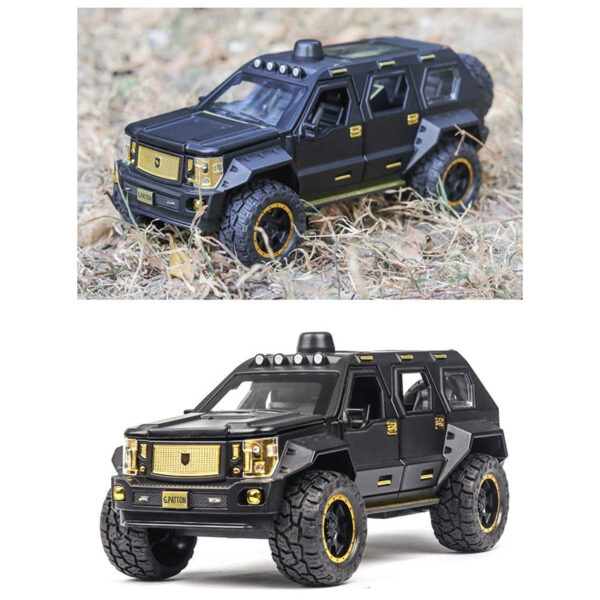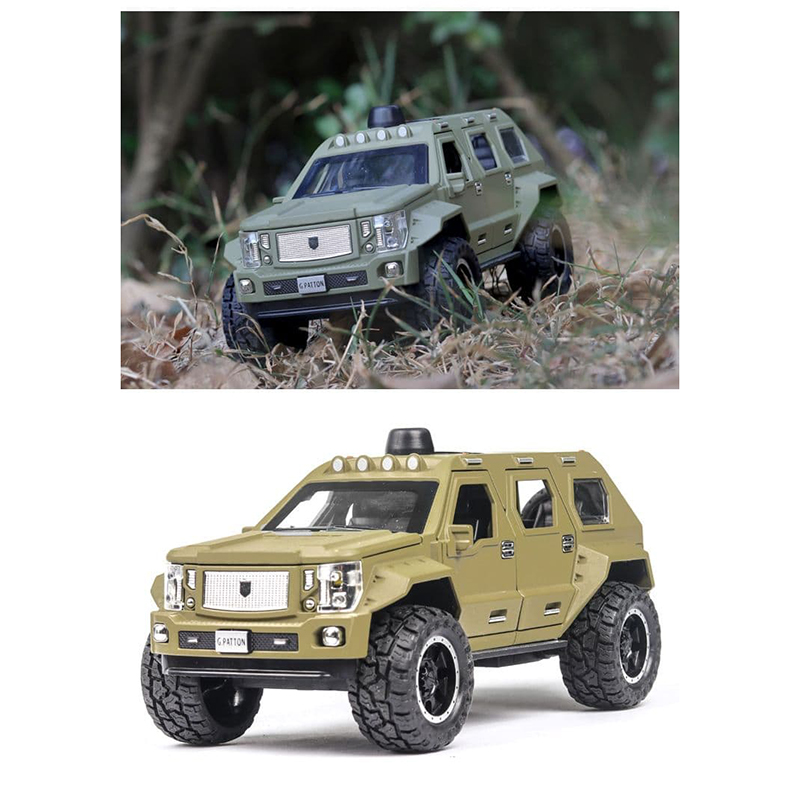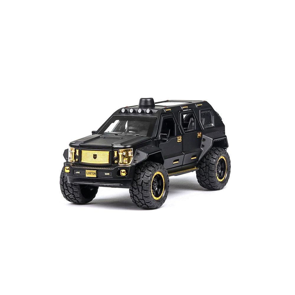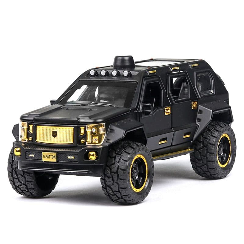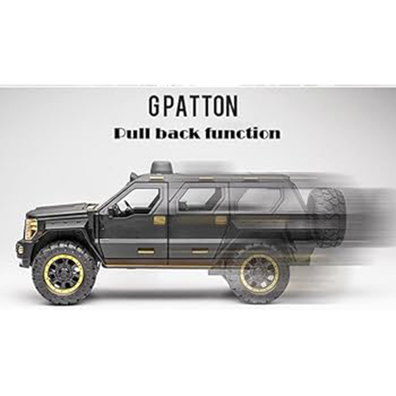 شاسی بلند G-Patton وسیله نقلیه ای است که از مدل هامرهای نظامی سابق را ایده برداری شده است. در واقع، G-Patton توسط شرکت US Specialty Vehicles از Rancho Cucamonga کالیفرنیا تولید شده است. این شرکت از یک کرگدن به سبک کاوالینو رامپانت در لوگوی شرکت خود استفاده می کند و اجناس خود را در ایالات متحده با نام تجاری راینو به فروش می رساند. G-Patton بر اساس فورد F-450 ساخته شده است و از نسخه ۳۶۲ اسب بخاری تریتون V-10 نیرو می گیرد. با وجود ظاهر زرهی، بدنه از یک ماده لانه زنبوری بین صفحات فولادی سبک ساخته شده است. در مقابل بیرحمی بودن استایل بیرونی، فضای داخلی با کفپوش ساج، سرپوش چرمی و صفحه نمایش اطلاعات سرگرمی عقب ۴۰ اینچی کامل شده است. گزینه های دیگر قابل نصب بر روی ماشین برای سفارش مشتری یخچال و دستگاه قهوه ساز می باشد. این ماشین بصورت موزیکال و عقب کش است و چراغ های قسمت جلو و عقب نیز روشن می شود . ۴ درب بغل و همچنین کاپوت و درب عقب ماشین نیز باز می شوند. این ماکت بسیار باکیفیت و با جزئیات ساخته شده است . این ماشین ها دارای بسته بندی تکی و جعبه ای نیست. جزئیات بیشتر این ماشین فلزی را در قسمت مشخصات محصول در نی نی شاپ سنتر ملاحضه کنید.