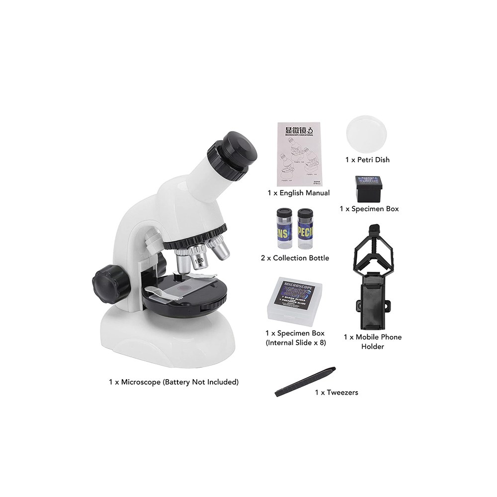 میکروسکوپ چراغ دار است که نیاز به ۲ باتری قلمی ۱.۵ ولتی دارد که درون جعبه موجود نمی باشد که برای استفاده راحت،
