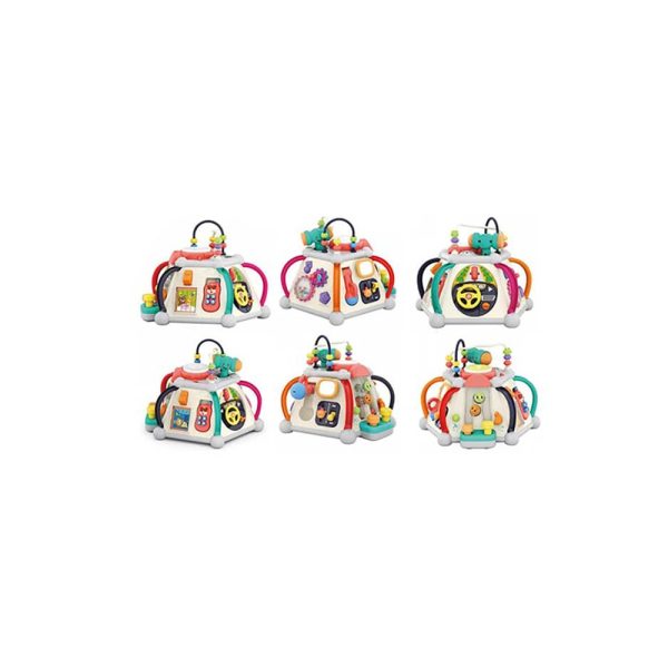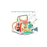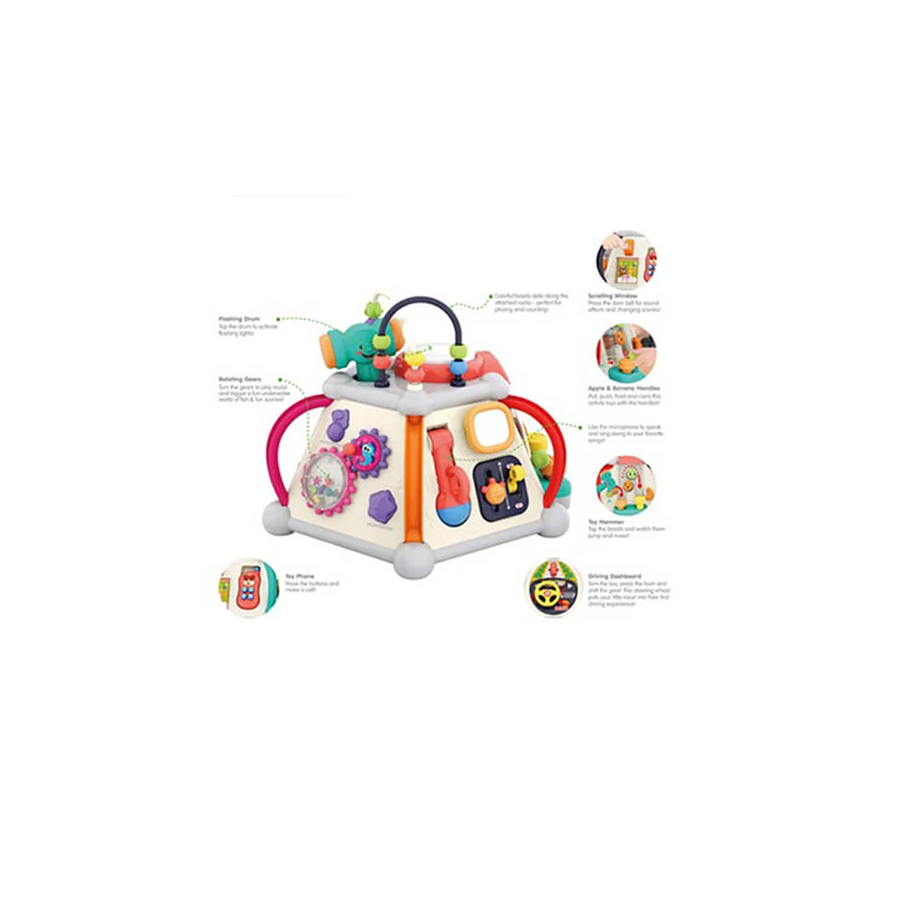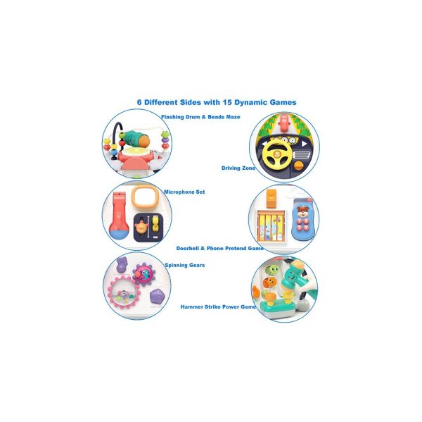 یک طرف این محصول ماشین موزیکالی قرار گرفته که کودک میتواند دکمه استارت را بزند و یک ماشین کوچک را با فرمان حرکت دهد .